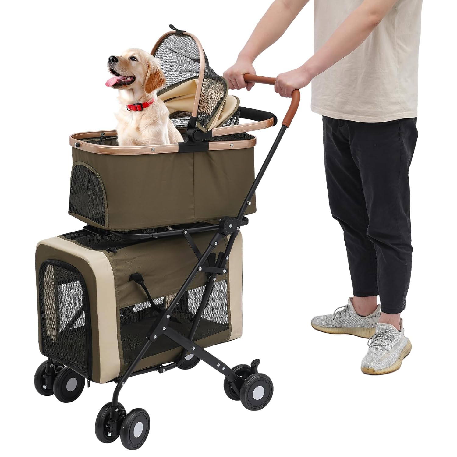 Foldable Pet Stroller for Small & Medium Dogs, Double Dog & Cat Stroller with 3-in-1 Travel System, Detachable Pet Carrier with Wheels for Cats and Dogs up to 77 lbs, Dark Green