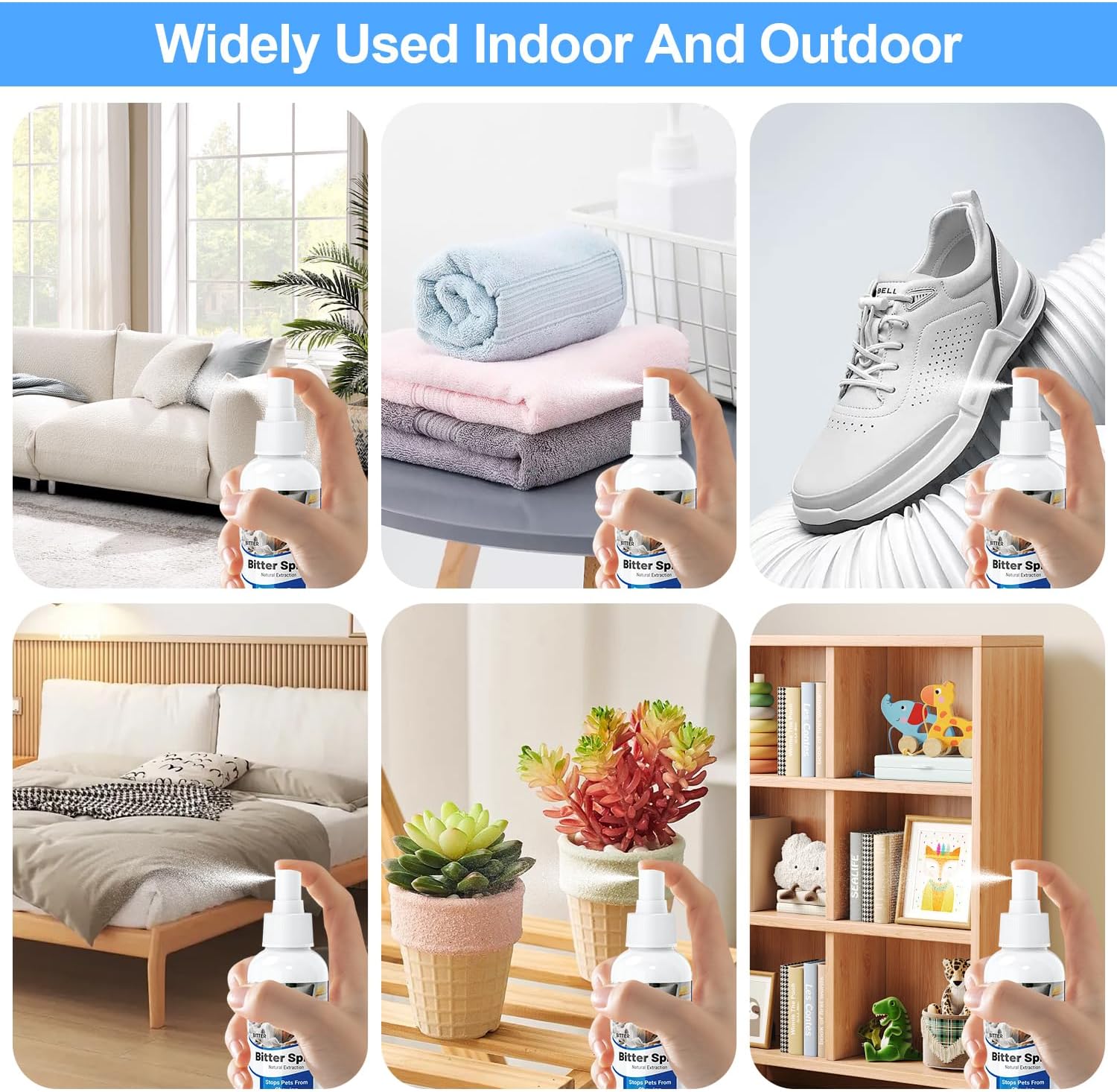 - [Widely Applicable Indoor Outdoor] - Our bitter apple spray for dog has a refreshing botanical scent and won't leave stains or residue. This no marking spray for dogs helps deter bad habits by stopping pets from licking, biting or chewing. Safe for pets and humans. Dog chewing spray deterrent - effective indoor & outdoor training aid. It can be used indoors for furniture, sofas, wardrobes, curtains, wiring, and also can be used outdoors for garden plants and even your car's interior. Caution: Avoid direct contact with your pet's eyes nose. For colored items, conduct a local test first to ensure that they will not fade.