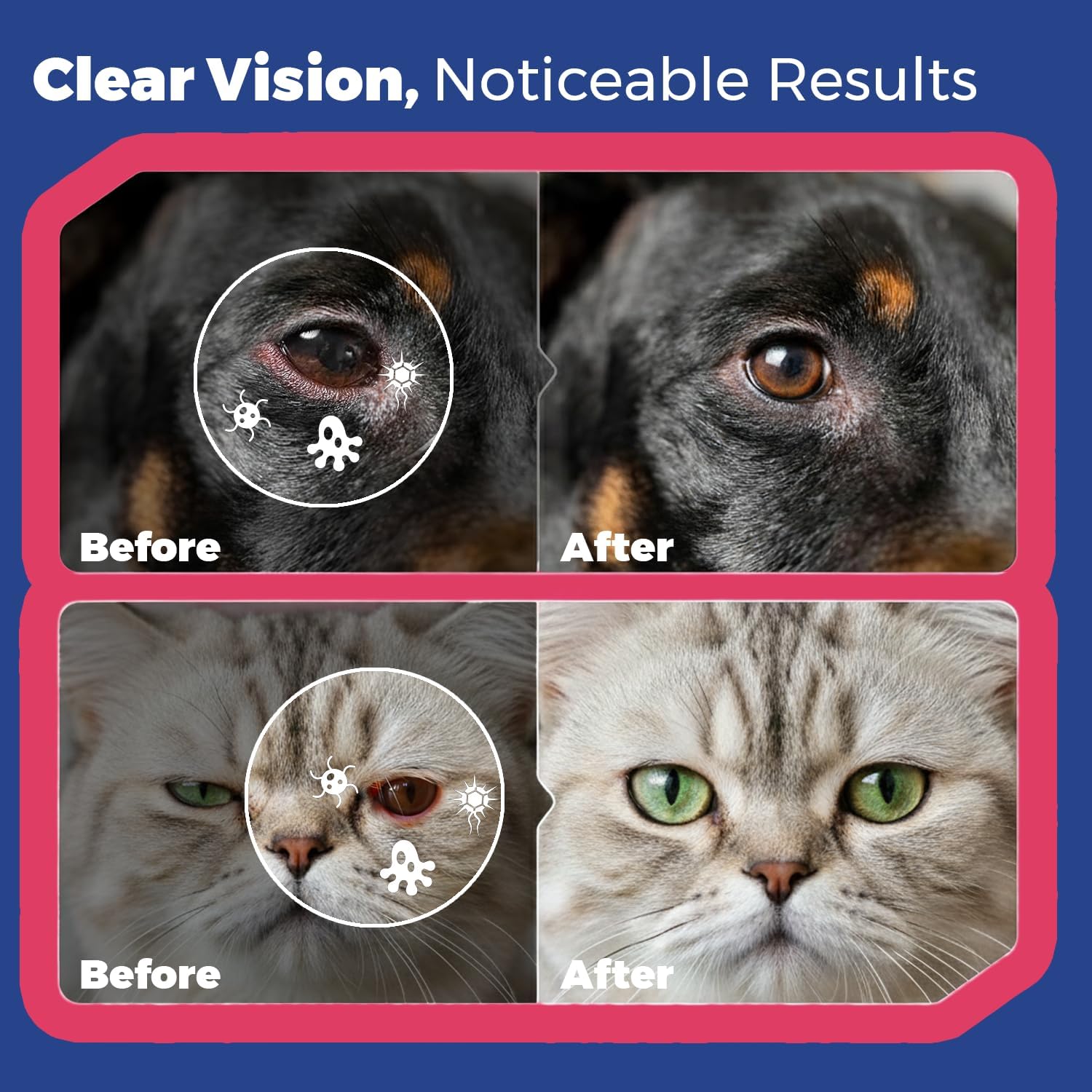 • Daily Cleaning - This eye drop for dogs and cats is suitable for daily eye care of pets, removes tear stains and smudges, restores the shine of the hair around the eyes and soothes canine, feline, and dog eye infection treatments, itchy foreign body discharge and other symptoms