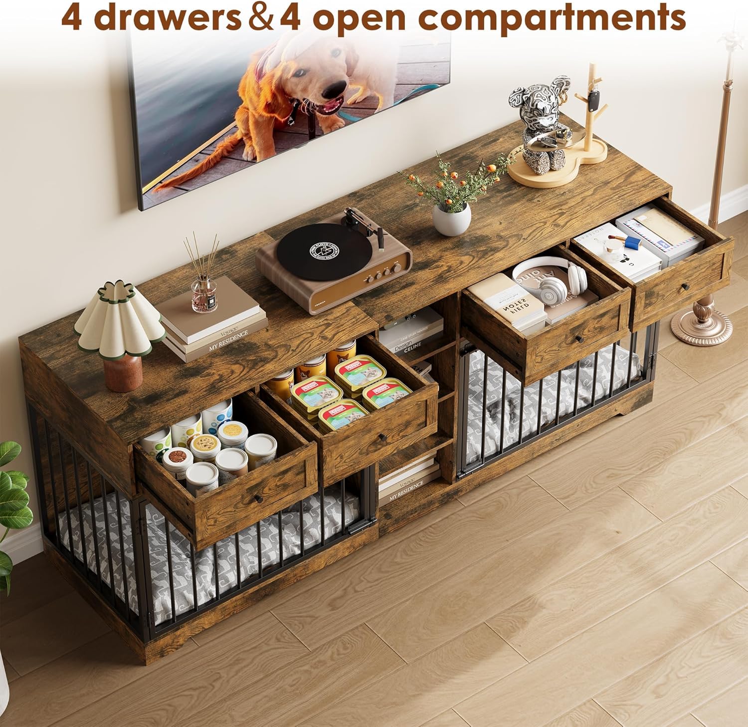 GarveeHome 82” Double Dog Crate Furniture, Large Dog Kennel Indoor for 2 Dogs, Heavy Duty Wooden Dog Crate TV Stand with 4 Drawers and Shelves, Brown